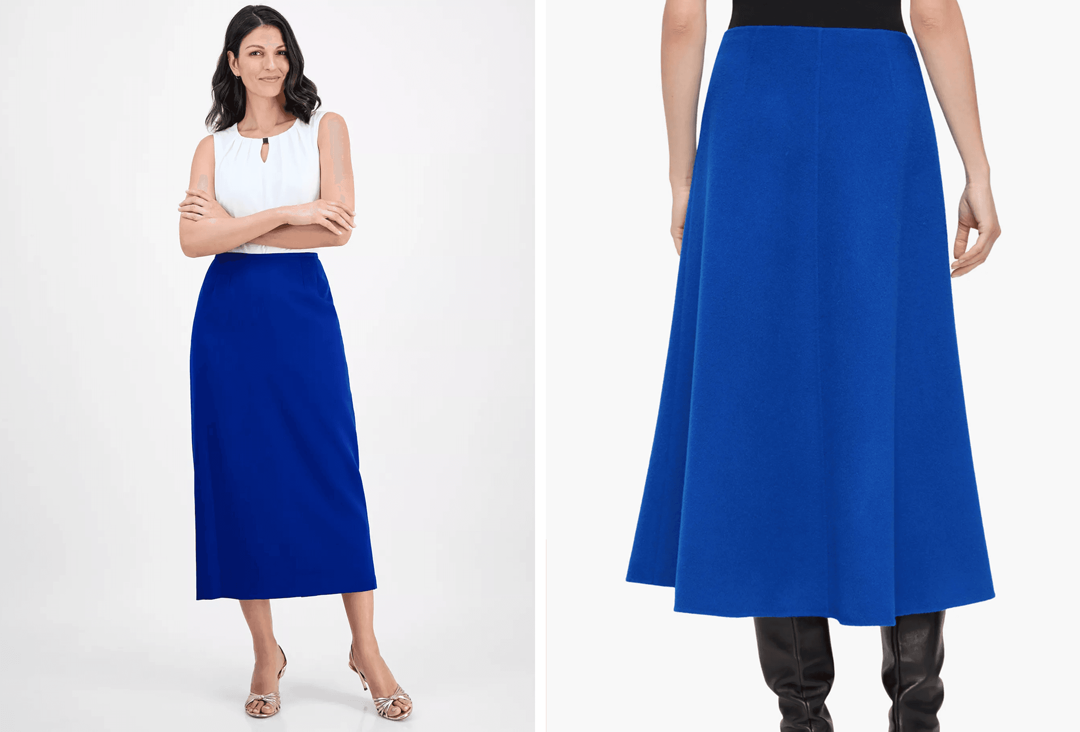 Only you can decide what makes the most sense for you! Take this trend: the cobalt midi skirt for spring. Would you rather choose the skirt on the left for literally 95% less than the skirt on the right? Usually, for a trendy piece like this, it's smarter to save.